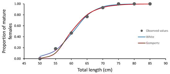 The length at maturity of N. entemedor off the southwest coast of the Baja California Peninsula (Bahía Magdalena) was reported to vary between 62 cm and 63 cm TL. This length interval represented approximately 68% of its maximum total length [19]. Meanwhile, Burgos-Vázquez et al. [18] estimated a value of 58.5 cm TL (CI = 51.7–65.4 cm TL) in the Bahía de la Paz (Gulf of California) using a logistic regression model. In this study, the length at maturity was less than that previously reported by Villavicencio-Garayzar [19]. This value was supported by a sigmoid model (GOM) with a different trajectory in comparison to WHI. The advantage of the GOM was that it had a more flexible form; it had a rapid inflexion point in the first length classes, showing a slower approach to the maximum fraction of mature females (asymptotic value). Thus, the comparison among the length-at-maturity models more frequently used and reported in the literature showed that the GOM fitted to the data was better than the logistic model.