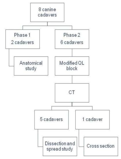 The study was divided into two phases (Figure 1). In the first phase, two cadavers were used for anatomical dissection. To perform this, cadavers were placed in lateral recumbency and received an extensive trichotomy of the abdominal region. The skin of the abdomen was removed, and the abdominal musculature dissected to observe the different muscle layers: external oblique, internal oblique and transverse abdominal. The costoabdominal (T13), cranial iliohypogastric (L1), caudal iliohypogastric (L2), ilioinguinal (L3) and lateral femoral cutaneous (L4) nerves were dissected/identified inside the interfascial plane between the transverse abdominal muscle and the internal oblique muscle. The same procedures were repeated on the contralateral side.