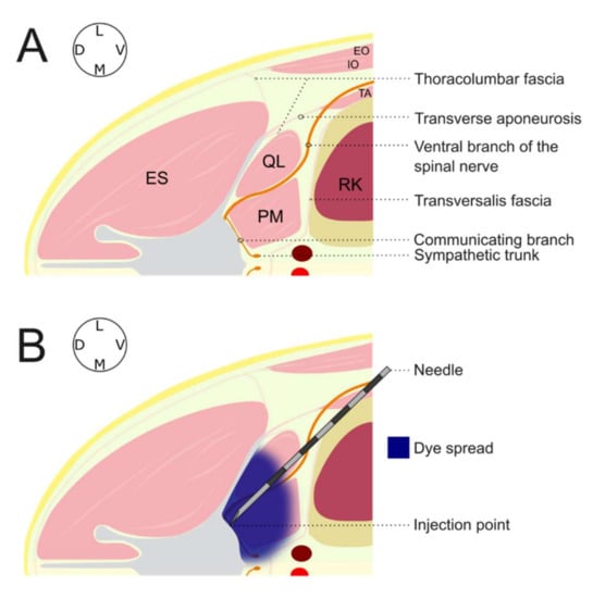 - Carline, L.; McLeod, G.A.; Lamb, C. A cadaver study comparing spread of dye and nerve involvement after three different quadratus lumborum blocks. Br. J. Anaesth. 2016, 117, 387–394. [Google Scholar] [CrossRef] [PubMed] [Green Version]