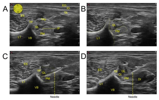 Ultrasound images of the modified approach to the QL block. (A) Sonoanatomy of the L1 region. (B) Schematic superimposition of the main anatomical structures. (C) Final position of the needle tip between the vertebral body and the psoas minor muscle. (D) Distribution of the injectate. L1, first lumbar vertebra; EO, external oblique muscle; IO, internal oblique muscle; TP, transverse process; TAp, transverse abdominal aponeurosis; TA, transverse abdominal muscle; ES, erector spinae muscles; QL, quadratus lumborum muscle; IP, interfascial plane; PM, psoas minor muscle; VB, vertebral body; DI, distribution of injectate; L, lateral; M, medial; D, dorsal; V, ventral.