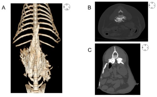 Computed tomographic images of the contrast spread after the administration of 0.6 mL kg−1 of a mixture of methylene blue and iopromide by a modified QL approach. (A) Volume-rendered three-dimensional projection image viewed from a ventral perspective of the thoracolumbar region. (B) Transverse image at L2 level with bone window setting. (C) Transverse image at L3 level showing contrasts presence in the left transverse abdominal plane. QL, quadratus lumborum block; L2; second lumbar vertebra; L3, third lumbar vertebra; Cr, cranial; Cd, caudal; L, left; R, right; D, dorsal; V, ventral.