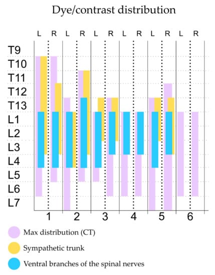 The objective of this study is to analyze, in canine cadavers, the pattern of distribution and the staining of the ventral branches of the spinal nerves and sympathetic trunk of a mixture of methylene blue and iopromide (50%) solution injected in a dorso-medial location compared with the approach described by Garbin et al. [2], between the PM muscle and the vertebral body of L1, at a volume of 0.6 mL kg−1 on each hemiabdomen.