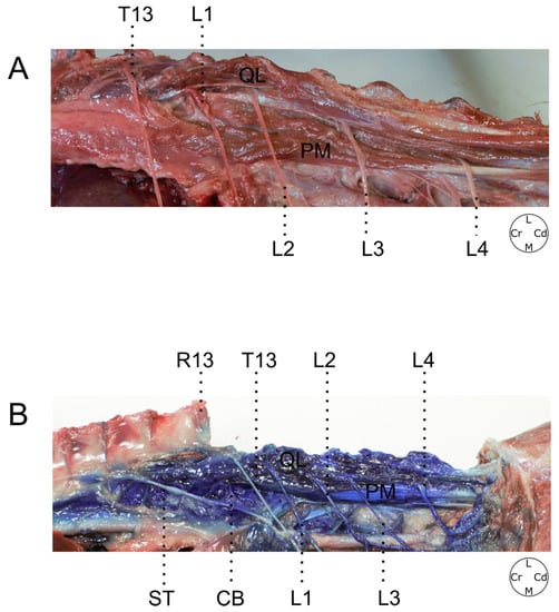 (A) Anatomical dissection of the thoracolumbar region. (B) Thoracolumbar region staining after methylene blue administration. T13; L1; L2; L3; L4, ventral branches of T13, L1, L2, L3 and L4 nerves respectively; QL, quadratus lumborum muscle; PM, psoas minor muscle; R13, 13th rib; ST, sympathetic trunk; CB, communicating branch; L, lateral; M, medial; Cr, cranial; Cd, caudal.