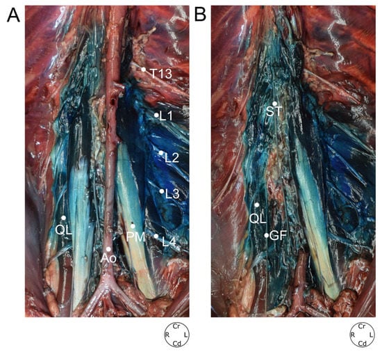 (A) Distribution of the dye through the quadratus lumborum and psoas minor muscles and spinal nerves. (B) Distribution of the dye through the lumbar sympathetic trunk after removing the right psoas minor muscle and the caudal aorta. T13; L1; L2; L3; L4, ventral branches of T13, L1, L2, L3 and L4 nerves respectively; GF, genitofemoral nerve; ST, sympathetic trunk; Ao, aorta; QL, quadratus lumborum muscle; PM, psoas minor muscle; Cr, cranial; Cd, caudal; R, right; L, left.