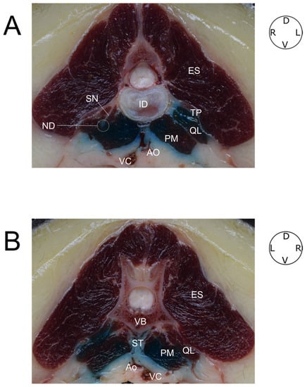 (A) Cranial view of a cross-section of the intervertebral disk and the caudal segment of L2. On the right side a spinal nerve can be observed leaving the intervertebral foramen and passing through the quadratus lumborum muscle. On the opposite side the presence of dye between the quadratus lumborum, the psoas minor muscles and the vertebral body can be observed. An intense coloration of the sympathetic trunk area between both psoas minor muscles is observed. (B) Dye distribution through the muscles and the sympathetic trunk area in a cranial vision of the center of L2. At this point, the spinal nerves cannot be seen. ES, erector spinae muscles; TP, transverse process; QL, quadratus lumborum muscle; PM, psoas minor muscle; ID, invetervebral disk; Ao, aorta; VC, vena cava; SN, spinal nerve; ND, nerve dyed; VB, vertebral body; ST, sympathetic trunk; D, dorsal; V, ventral; L, left side; R, right side.