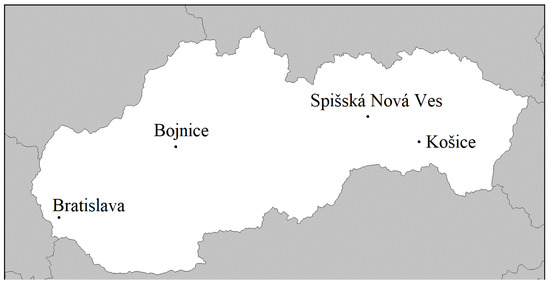 The four zoos are located in different Slovak regions (Figure 1). The Bojnice Zoo from the western region is a 42-hectare facility, and is the oldest and most frequently visited zoo (~350,000 people annually); compared with the other zoos, it has the highest species diversity (~400 species, Table 1). The zoo is located in Bojnice, a small town of ~5000 inhabitants, and does not specialize in breeding any specific species. The zoo in Košice is the third largest zoo in Europe (its area is 288 hectares), and is located in East Slovakia in the second largest Slovakian city (~240,000 inhabitants). The zoo is home to about 200 species of animals, and its visitation rate is about 200,000 people per year. The Bratislava Zoo, in the country’s capital city (~450,000 inhabitants), has an area of 96 hectares. It has more than 150 animal species. It also has a high visitation rate, approximately 300,000 people annually. The zoo in Spišská Nová Ves is the smallest of the four zoos (8 hectares) included in this study, and is located in East Slovakia, with about 100 species of animals. The city has about 40,000 inhabitants. It has the lowest visitation rate: about 100,000 people per year come to visit this zoo.