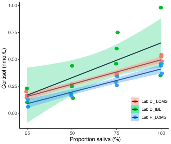 Dilution series for saliva cortisol analyzed at two laboratories (Lab R and Lab D). Saliva was collected over some days, accumulated, and then diluted with different proportions of 0.9% NaCl solution. Saliva samples were analyzed with two different methods LC-MS/MS (LC-MS) and immunoassays (IBL).