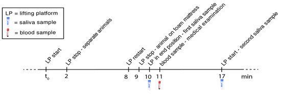 The specially designed Sarstedt “Cortisol-Salivette” (order number: 51.1534.500) was used for saliva sampling. This consists of a 4.2 cm-long roll of synthetic wadding that is inserted into a plastic container containing a small hole at the bottom and is located in a plastic tube. After taking the sample, the centrifugation of the Salivette device results in low-viscosity saliva at the bottom of the tube. The zookeepers who took the samples followed the instructions listed in the Appendix A. For sampling, the swab was moved back and forth on the side of the tongue for 5 s (see Figure A1). After sampling, the samples were centrifuged for 5 min at 5000 rpm in the veterinary laboratory, and then the saliva remained in the tube was stored at −20 °C or lower.