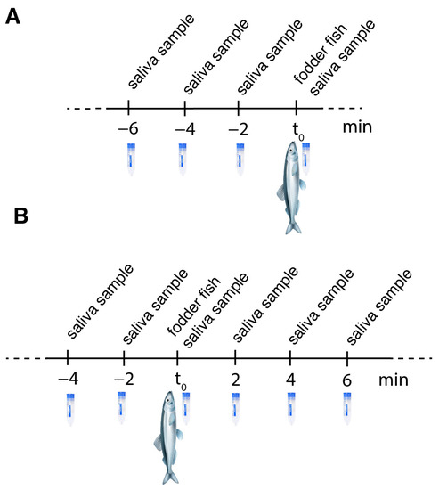 Fixed saliva sampling schemes used for (A) feeding experiment I and (B) feeding experiment II.