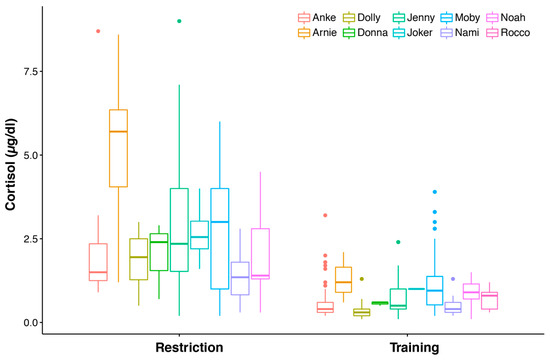 We used different assays with slightly different standardizations and some blood samples were taken from animals that had health issues and had medication (n = 116). However, we never used any glucocorticoids as a medical treatment. If glucocorticoids are given, one has to be careful, as there is an attenuating effect of dexamethasone administration on cortisol release [67]. We fitted a linear mixed-effects model with treatment, assay, and health status as fixed factors and animal ID as a random factor and compared (ANOVA) it to a null model with only test assay and health status as fixed factors. We found that the treatment (restriction or training) had a significant effect and that all animals’ blood cortisol levels were consistently higher when they were restricted than they were during training (LMM, χ2(1) = 169.61, p < 0.0001; see Figure 5 and Table A1). Meanwhile, health status was found to have no effect (LMM, χ2(1) = 0.4092, p = 0.5224; see Figure A2A). The assays also had a significant effect on the blood cortisol values, but this was lower than the training effect (LMM, χ2(1) = 32.948, p < 0.0001; see Figure A2B).