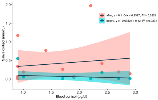 Correlation between blood cortisol values and saliva values during restriction. A linear curve was fitted (see Figure A3 and Figure A4 for other curves). Saliva samples were taken before (green dots) and after (red dots) the blood samples; see Figure 3 for an exemplarily sampling scheme. Three dolphins were sampled (Jenny = 9 samples; Moby = 1 sample; Anke = 1 sample; Nami = 2 samples before, 3 samples after).