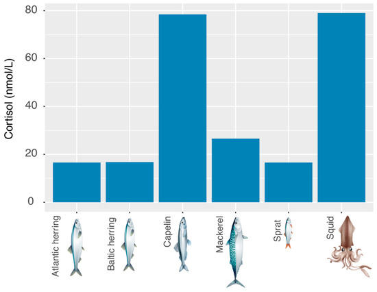 Cortisol values of different fodder fish and cephalopods. We measured samples taken from the thawing water of a 20 kg block of Atlantic herring, a 15 kg block of Baltic herring, a 5 kg block of capelin, a 20 kg block of mackerel, an 8 kg block of sprat and an 8 kg block of squid.
