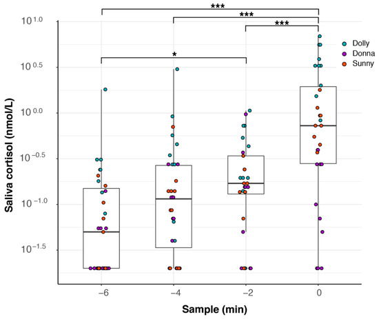 Saliva cortisol values during feeding experiment I. Saliva samples were taken every 2 min over a course of 6 min. At minute 0, dolphins were fed with fish (capelin, Mallotus villosus) and a saliva sample was taken directly afterwards. The experiment was conducted with 3 female dolphins and repeated 10–11 times (for Dolly and Donna, 11 times; for Sunny, 10 times). Some selected significance levels of Tukey’s pairwise post hoc comparisons are indicated as follows: * p < 0.05, *** p < 0.001. For all results, see Table A2.