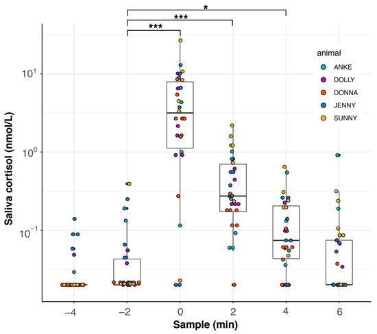 Saliva cortisol values during feeding experiment II. Saliva samples were taken every two minutes over a course of 10 min. At minute 0, dolphins were fed with fish (capelin, Mallotus villosus) and a saliva sample was taken directly afterwards. The experiment was conducted with 5 female dolphins and repeated 5–7 times (Anke, 5 times; Dolly, Jenny, and Sunny, 6 times; Donna, 7 times). Some selected significance levels of Tukey’s pairwise post hoc comparisons are indicated as follows: * p < 0.05, *** p < 0.001. For all results, see Table A3.