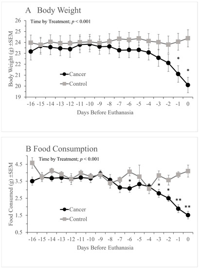 Mean daily body weight (A), food consumption (B), water consumption (C) and nest quality (D) in the cancer or control groups during the final 17 days before each mouse was euthanized (Day −16 to 0 inclusive). Asterisks denote the results of post-hoc analyses, i.e., days on which the cancer or control groups differed significantly (*, p < 0.05; **, p < 0.01: after Bonferroni correction). Note that while nest building (C) declined most dramatically (2 to 3 days before euthanasia), reduced food consumption was detected up to 4 to 5 days prior to euthanasia (B). Each figure (A–D) shows there was a significant ‘Time’ by ‘Treatment’ interaction; p < 0.001. Cancer/Control, n = 16.