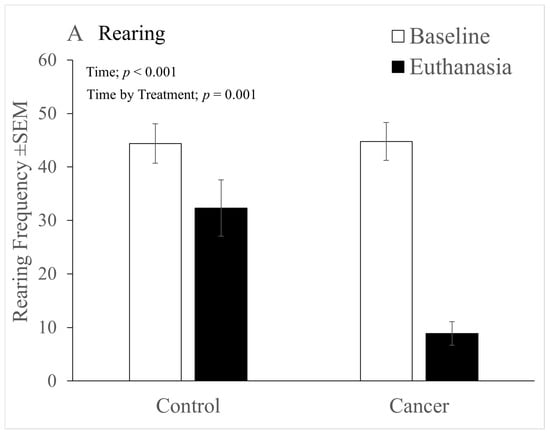 The body weight and food and water consumption data were determined from the daily lab records, assessing absolute weights each day. Nest quality was scored from 1–5 [19]. The behaviour footage was transferred to a PC for analysis using HomeCageScan (HCS) software (Cleversys Inc., Reston, VA, USA). This system is hardcoded to recognise common mouse behaviours and provides an output of their frequency and duration (the list is shown here: http://cleversysinc.com/CleverSysInc/csi_products/homecagescan/, accessed on 22 December 2021). We have previously used this system in detecting the negative impacts of cancer in mice [2,3,4]. As in these previous studies we conducted exploratory analyses to determine which of the activities were most altered as cancer progressed, which were rearing, walking, inactivity, and grooming.