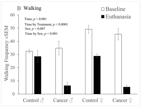 As the study progressed the only activities that changed substantially related to the general ability of the mice to move. These were rearing, walking, and whether they were inactive or grooming. Although the HCS system produces data on both the frequency and duration of behaviour, the duration data were no more informative than the frequency results so only these data are described. Rearing (Figure 3A) showed a significant general decline over the course of the study (‘Time’ factor significant; (F(1,24) = 58.15, p < 0.001), and the change was far more obvious in mice with cancer (significant ‘Time’ by ‘Treatment’ interaction; F(1,24) = 11.71, p = 0.001). Rearing was not affected by sex or handling method. Figure 3B depicts several significant outcomes that were found in the analysis of walking behaviour. Tumour development caused walking to decline significantly over time (‘Time’ factor significant; F(1,24) = 105.1, p < 0.001), but again, more substantially in the cancer group (significant ‘Time’ x ‘Treatment’ interaction; F(1,24) = 22.54, p < 0.0001). Females were also generally more active than males (‘Sex’ factor significant; F(1,24) = 8.6, p = 0.007), and furthermore, females showed a significantly greater reduction in walking over the course of the study than males (significant ‘Time’ x ‘Sex’ interaction; F(1,24) = 13.96, p = 0.001).