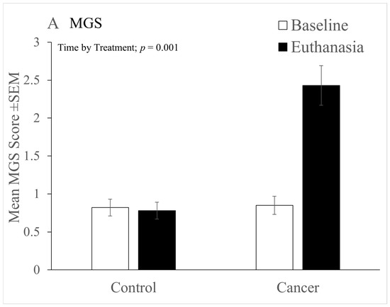 MGS scores were similar between the cancer and control groups at baseline (0.87 ± 0.5 vs. 0.8 ± 0.45, cancer vs. control). They remained unchanged from baseline to euthanasia in control mice (0.77 ± 0.45) but were significantly increased in those with cancer (increasing to 2.3 ± 0.8, giving a significant ‘Time’ by ‘Treatment’; F(1,24) = 20, p < 0.001) (Figure 4A). There were no significant effects of handling and no effect of sex.