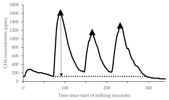 The CH4 concentration (v/v) measured by each analyser was recorded at 1 s intervals on a data logger (Simex SRD-99; Simex Sp. z o.o., Gdańsk, Poland) and visualised using logging software (Loggy Soft; Simex Sp. z o.o, Gdańsk, Poland). The CH4 concentration during milking was recorded in parts per million (v/v) (Figure 1). Then CH4 concentration data were extracted from the time-series signal using the peak analysis tools in MATLAB Signal Processing Toolbox (version R2018a, The MathWorks, Inc., Natick, MA, USA. See [] for metrics). Peak analysis tools were used to identify eructation peaks and extract the maximum amplitude within each milking from raw logger data for the analysis.