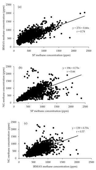 In the current study, three analysers were compared. There was a positive correlation between CH4 measurements from individual milkings obtained using the three gas analysers (r = 0.57 to 0.74) (Figure 2a–c). Measurements from the SP and IRMAX analysers had the highest correlation (r = 0.74; Figure 2a).