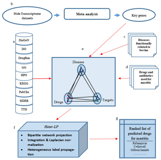The workflow for this research. (a) Data related to diseases, drugs, and their targets gathered from different data sources (Table 1). (b) Key genes with robust bio-signatures and key regulatory effects in response to E. coli (Table 2). (c) Diseases or biological processes functionally related to mastitis identified by using the Pathway Studio web tool (Figure 2). (d) Drugs and antibiotics relevant to E. coli mastitis gathered by literature mining (Table 3). (e) A suitable heterogeneous network constructed by integration of data from parts A, B, C, D (f) Running the Heter-LP algorithm on the constructed network to predict important relations involved in mastitis (described in Section 2.2). (g) Predicted drugs, ranked according to their score computed by Heter-LP (Table 4 and Supplementary Table S2).