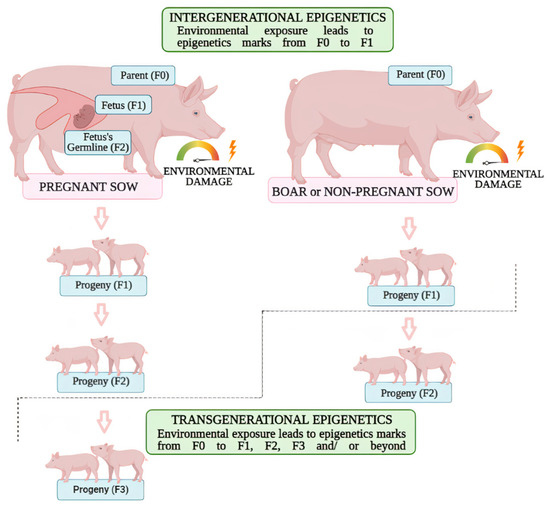 Intergenerational and transgenerational epigenetics is one of the most discussed topics in the field of epigenetics inheritance. Current literature supports the understanding that the transmission of epigenetics marks from one generation (F0) to the next (F1) represents an intergenerational event; while the transmission acquired in F0 that is transmitted to the third or fourth generation (F2 for males or F3 for females) can be considered as transgenerational epigenetic event [81]. In other words, different numbers of generations are directly affected by environmental insults in males and non-pregnant females when compared to pregnant females. This happens because the majority of female mammals have their oocytes produced during their fetal development [82,83]. For example, the por-cine female fetuses’ gonads differentiate into an ovary containing gamete cells by day 30 of pregnancy and by mid-gestation primordial follicles are already recognizable [84]. Consequently, if a pregnant female suffers a potential epigenotoxic environmental exposure, not only will the fetus be directly affected by this environmental insult, but also the germ cells of the fetus. In summary, three generations can be epigenetically affected by an environmental insult: F0 (somatic and germ cells of the pregnant female), F1 (fetus), F2 (germ cells of the fetus) [81,85,86]. Figure 1 was provided for exemplification, using the porcine model.