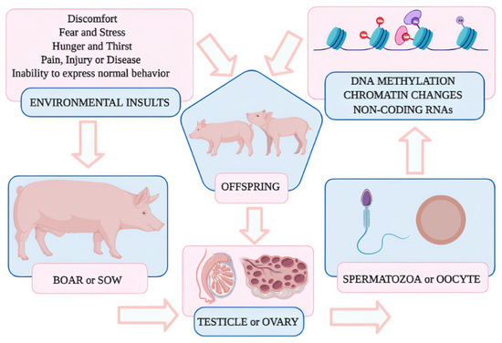 Although the most characterized epigenetic studies have been conducted in small experimental animals, such as rodents [79,87,88,89], insects [13], and worms [90], a representative number of studies have been done on domestic animals, such as pigs [89,91,92,93,94,95]. In the following section, we will discuss in detail studies focused on pigs as models in epigenetic investigations and draw attention to the role of stress as an epigenetic modulator.