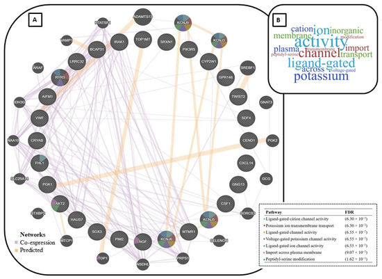 Prediction of the gene network (A) and most cited pathways (B) in which the genes play a role using the human genome as a reference.