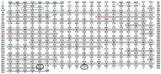 Nucleotide and deduced amino acid sequence of omMc3r. The positions of nucleotides and amino acids are marked on both sides. Gray shading indicates the seven-transmembrane domain (7TMD). Red letters highlight the conserved motifs (PMY, DRY, and DPLIY). Solid black boxes frame the N-glycosylation sites. Black circles represent the phosphorylation sites at the C-terminus. Asterisk (*) denotes a stop codon. The primer pairs utilized for amplification are shown by the blue line.