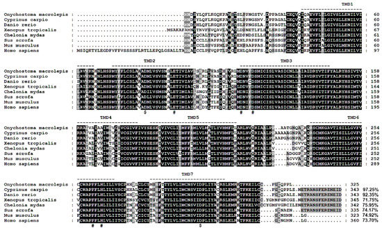 Multiple amino acid sequence alignments of MC3Rs between O. macrolepis and other species. Dashed lines represent the transmembrane domains. $ indicates amino acid residues important for ligand selection. # denotes amino acid residues crucial for ligand binding and signaling transduction.