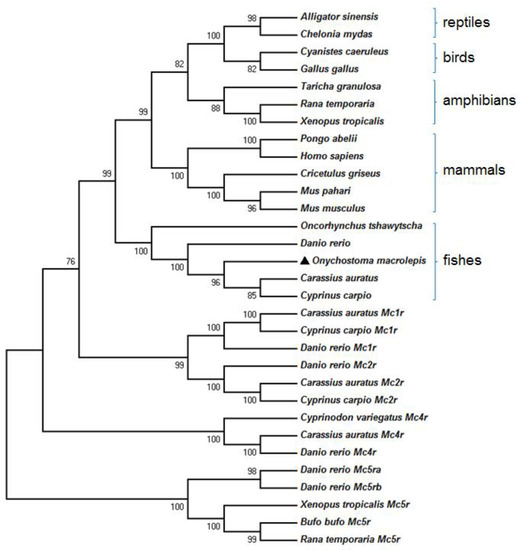 Phylogenetic analysis based on the amino acid sequence showed that the MC3Rs of fish, amphibians, birds, and mammals clustered into one group. The putative protein of omMc3r is classified into the group of bony fish and shows the most recent evolutionary relationship with Carassius auratus and Cyprinus carpio (Figure 3).