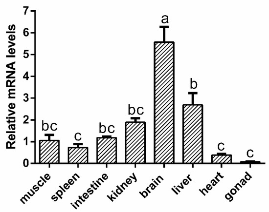 The O. macrolepis used in this experiment were obtained from the Ankang Fisheries Experimental and Demonstration Station, Northwest A&F University (Shaanxi, China). A total of nine fish were used in this study, with a mean (SD) body length of 23.5 ± 3 cm. The fish were euthanized with 2-phenoxyethanol at a dilution of 1:500 and dissected quickly. The brain, gonads, liver, heart, intestines, spleen, kidneys, and muscle were collected for RNA extraction. Total RNA of each tissue was extracted using the Trizol method. The quality of total RNA was determined by 260/280 ratios with a NanoDrop ND-1000 spectrophotometer (NanoDrop Technologies, Wilmington, DE, USA). The samples with a 260/280 ≥ 1.9 were used for cDNA synthesis and they were treated with a Turbo DNase kit (Ambion, Austin, TX, USA) before use.