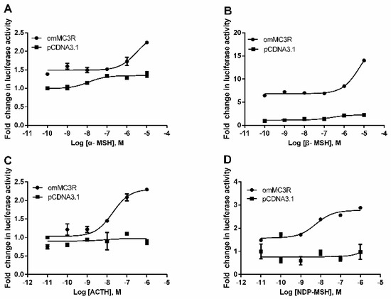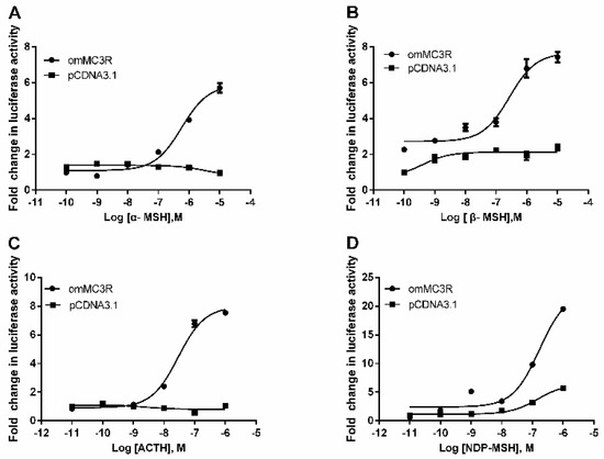Activation of cAMP signaling mediated by omMc3r. The pGL4-CRE luciferase reporter system (pGL4.29 vector) was used to monitor the effects of α-MSH (A), β-MSH (B), ACTH (1–24) (C), and NDP-MSH (D) on the HEK293T cells transiently transfected with omMc3r expression plasmid, as described in Section 2. The results were presented as fold change of the agonist-treated groups relative to the DMEM serum-free medium-treated group. The empty vector pcDNA 3.1 was used as a negative control. Each data point represents mean (SD) of three independent experiments.