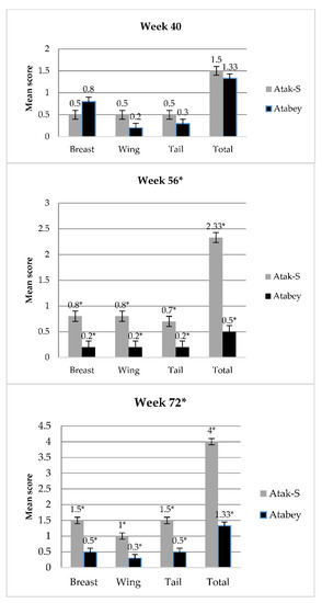 Plumage condition (mean score) of individual body part, by age (week 40, 56, and 72) and genotype (Atak-S or Atabey). Bars represent mean ± SE. (* p < 0.01, n = 70 laying hens/pen).