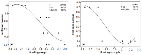 Linear regression of the relationship between keel bone damage and egg breaking strength in (a) Atak-S hens (p = 0.002) and (b) Atabey hens (p < 0.001).
