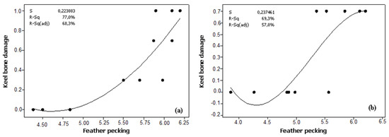 Linear regression of the relationship between keel bone damage and the prevalence of feather pecking in (a) Atak-S hens (p = 0.001) and (b) Atabey hens (p = 0.002).