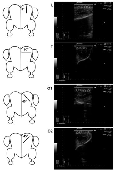 Diagrammatic representation of scanning planes (left panels; L-longitudinal, T-transverse; O1 and O2-oblique) and corresponding ultrasonographic images of pectoral muscles (right panels) in ultrasonographically examined organic turkeys. The angels are between the midline axis (sternum and keel bone) and the casing of a transducer placed above the left pectoralis major muscle. Light grey dots in both sets of panels show direction of the transducer probe applied to the bird’s skin. White hollow circles in ultrasonograms illustrate potential placement of spot meters used for echotextural analyses of muscle tissue.