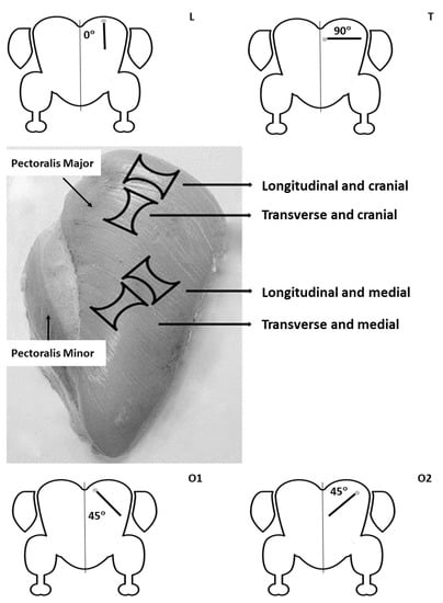 A figure illustrating the course of muscle fibers within the cranial and medial segments of the pectoralis major muscle of turkeys in relation to scanning planes or a position of the shaft of a transducer during ultrasonographic examinations (L-longitudinal, T-transverse, and O1 and O2-oblique). The angels are between the midline axis (sternum and keel bone) and the casing of a transducer placed above the left pectoralis major muscle. Light grey dots show direction of the transducer probe applied to the bird’s skin.