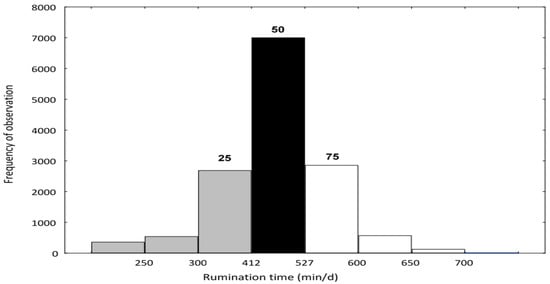 A total of 365 high-yielding (11,264 kg/305 days lactation) Polish Holstein-Friesian multiparous dairy cows were included in the study covering 24 to 304 days of lactation. In total, 14,274 daily complete (cow and all milk production traits) observations were collected. Data were collected in a production environment. Data from cows were assigned to three groups based on individual cow average daily rumination time (Figure 1): low rumination up to 412 min/day (L, up to the 25th rumination percentile), medium rumination from 412 to 527 min/day (M, between the 25th and 75th percentile), and high rumination above 527 min/day (H, from the 75th percentile).