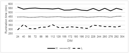The trend of rumination time by cows classified as high (H), medium (M), and low (L) rumination animals. High rumination (H) from 527 min/day, medium rumination (M) from 412 to 527 min/day, and low rumination (L) to 412 min/day.