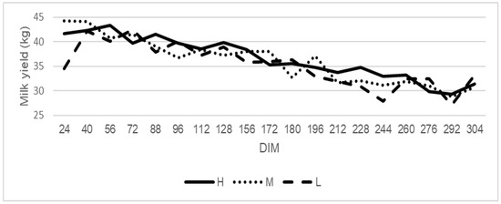 The trend for milk production in cows classified as high (H), medium (M), and low (L) rumination animals. High rumination (H) from 527 min/day, medium rumination (M) from 412 to 527 min/day, and low rumination (L) to 412 min/day.