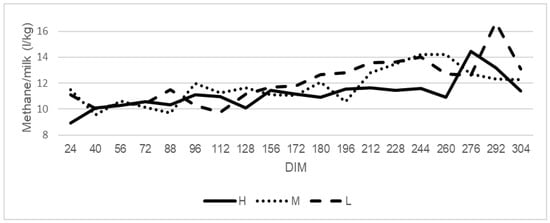 The trend for methane emission on milk production (CH4/milk) in cows classified as high (H), medium (M), and low (L) rumination animals. High rumination (H) from 527 min/day, medium rumination (M) from 412 to 527 min/day, and low rumination (L) to 412 min/day.