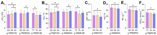 3.3. Association Analysis of Genotype and Haplotype Combinations with Blood Gas Indicators