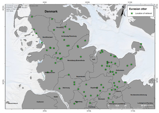 After huge declines in the past, the Eurasian otter (Lutra lutra) (Linnaeus, 1758) population is recolonizing former habitats in Western Europe, including Germany [1,2,3]. This includes the northernmost German federal state Schleswig-Holstein, where otters are detected area-wide nowadays, and which functions as an important bridge between German and Danish populations [4,5,6]. Lutra lutra remains a species that is strictly protected by national [7] and international law [8]. The International Union for the Conservation of Nature (IUCN) lists Eurasian otters as “near threatened” globally [9], whereas this differs among countries and also federal states in Germany [3,10,11]. During the last decades, there has been a rapid increase in the number of otters found dead in Schleswig-Holstein, Germany (A. Drews, pers. communication), together with sightings and population surveys [12] indicating a growing population and demanding a better understanding of the reestablishment of otters. To allow for successful long-term population management, detailed post-mortem investigations are essential for elusive and protected species like Lutra lutra [13]. Standardized necropsies of otters found dead can serve as a valuable diagnostic tool to assess the health status of populations [14,15,16,17]. As seen in other studies, otters were infected with dolphin morbillivirus in Italy [18], unspecified distemper virus in Denmark and Germany [19], or canine and feline parvovirus in Southern Italy [20]. The role of otters in the current SARS-CoV-2 pandemic still remains unclear, whereas other mustelids are highly susceptible to the virus [21,22]. Bacteria, such as certain streptococci [15,23] or zoonotic Vagococcus lutrae [24], also affect otter populations. Pneumonia due to fungal agents, such as Emmonsia spp., leading to clinical adiaspiromycosis, reportedly occur among otters [25,26]. Other relevant infectious agents include ectoparasites, such as ticks [27,28], and endoparasites like Sarcocystis lutrae [29,30], Isthmiophora melis [31,32], Corynosoma spp. [33,34], or Toxoplasma gondii [35,36]. Still, there is certain bias that needs to be taken into account, especially when using mainly roadkill [17]. The latest published otter post-mortem data from Germany are restricted to the population in eastern federal states [17,32,37]. This study aimed to investigate the health status and causes of death of the otter population in Schleswig-Holstein in order to set baselines for an actual monitoring program, including assessment of infectious agents, age determination, sex and reproductive activity.