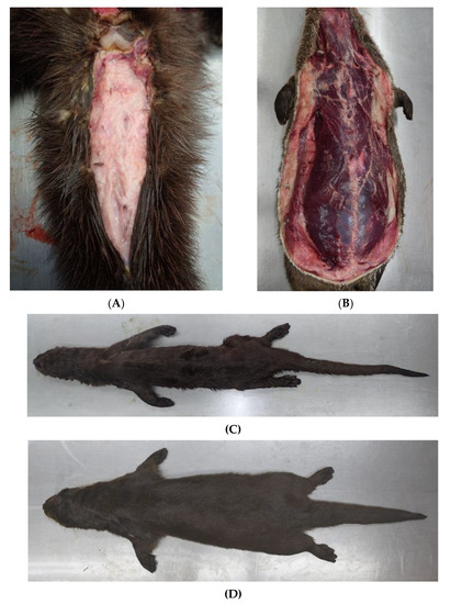 Otter in good nutritional status with a lot of subcutaneous fat in the tail radix region (A) and along the body (B). Severely emaciated otter (C) in comparison to an individual in good body condition (D).