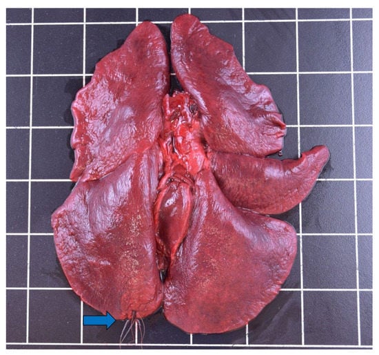 Lung tissue samples and swabs (Sigma Virocult, polyurethane tip 20 mL, Virocult fluid medium, Check Diagnostics GmbH, Westerau, Germany) were taken and stored at −70 °C until analysis. Furthermore, short sections of closed small intestinal loops were sampled and stored at −70 °C until analysis. Investigations were carried out at the Institute of Virology, University of Veterinary Medicine Hannover, Foundation, Hannover, Germany. A TaqMan real-time PCR was used for the detection of canine and feline parvovirus genomes [48]. Screening for morbillivirus-specific nucleic acid was performed by reverse transcription–polymerase chain reaction (RT-PCR) [49]. An established RT-qPCR protocol was applied for the detection of SARS-CoV-2 RNA [50].