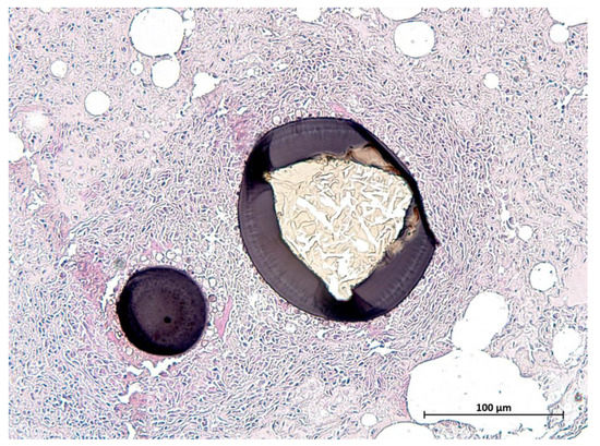 Lymphohistiocytic and plasmacytic, interstitial, and eosinophilic pneumonia were detected most often (n = 12), and affected predominantly females (n = 4) between 1.3–5.5 years and one male (2.5–3.5 years). This was followed by granulomatous pneumonia (n = 7), twice with intralesional foreign material (Figure 3), which disproportionately affected male otters (n = 6) between 0.75–3.5 years compared to females (n = 2), for up to 5.5 years.