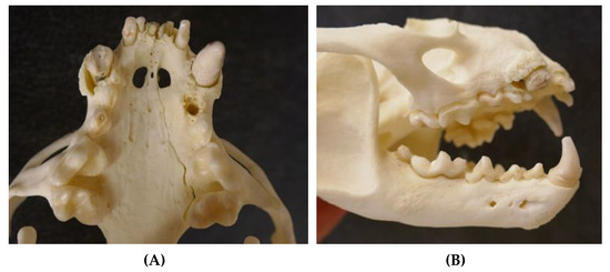Severely worn-down teeth of an adult male otter (5.5–7.5 years) from Schleswig-Holstein; some teeth are even missing ((A) ventral view upper jaw and (B) lateral view skull).