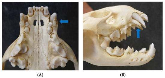 Erupted permanent teeth and deciduous teeth (blue arrow) in a male otter cub from Schleswig-Holstein ((A) ventral view upper jaw and (B) lateral view skull).