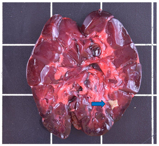 Nephrolithiasis (blue arrow) in the kidney of a male otter from Schleswig-Holstein.